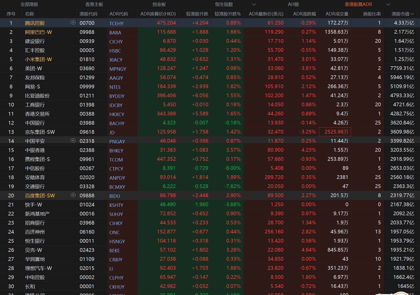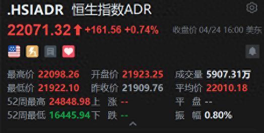 智通财经APP获悉,周四美股三大股指上涨,恒生指数ADR上涨,按比例计算天津炒股配资开户,收报22071.32点,较香港收市上涨161.56点或0.74%。